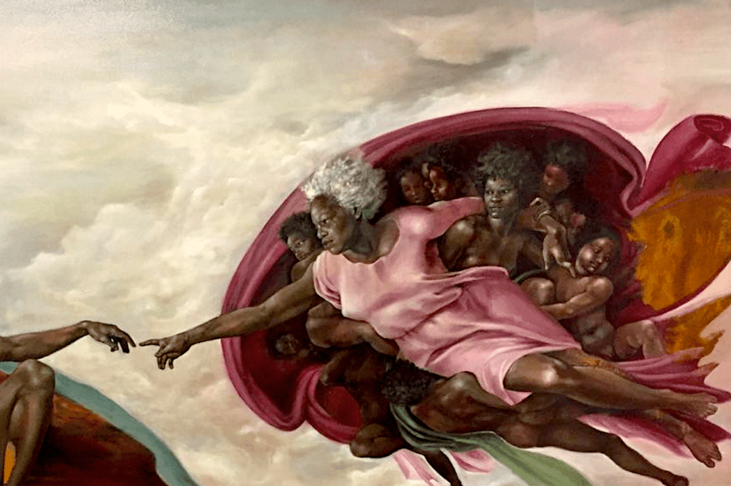 What was your instantaneous thought at the first view of this painting? Was it a smile, a degree of comfort for seeing yourself when God is a woman? Do you relate more because God looks more like a mother with her children than a Man with his cherubs? Was it because God is represented as a person of color? Was it jarring? Did a person’s name come to mind that would hate this painting, and is that your way of avoiding your own feelings? Or were you uncomfortable because that is just not the image Of God you had in mind? Which image makes you most comfortable, Michelangelo’s or Rosales’? Why? What if the image was reimagined with a human in a wheelchair or blind? What if in Michelangelo’s painting was a person with cerebral palsy or Jesus with his cruxifixction scars? What do you think God would say about these paintings and thoughts compared to God’s own self-image in the Bible? (Okay a Christian parent’s joke … I can’t stop hearing in my head the voice in the cartoon Veggie Tales; “questions, questions questions”.)